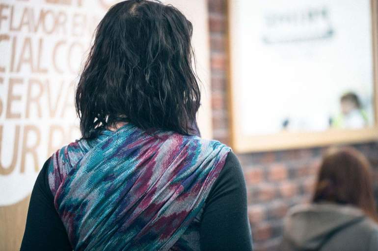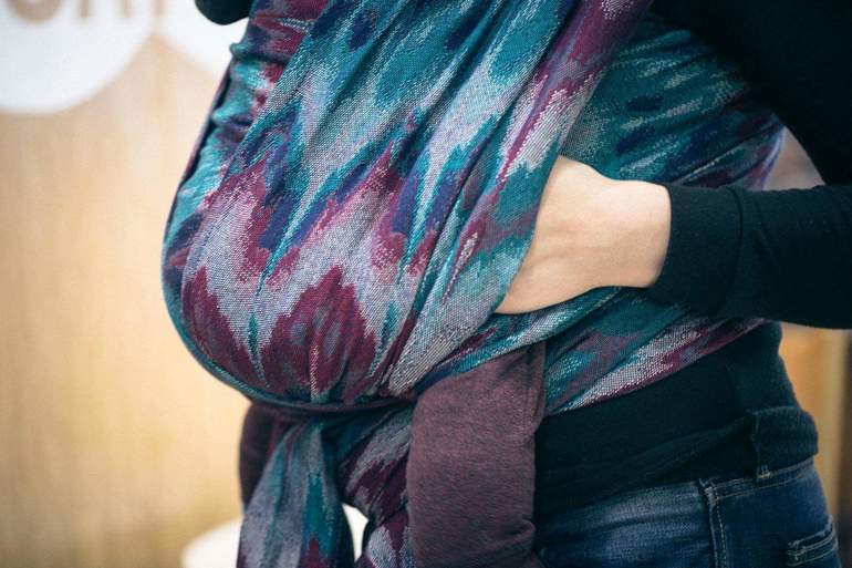 Что же я могу рассказать об этом шарфе? Как заявляет производитель, паттерн Симфония - это их попытка запечатлеть музыку на ткани. Объективно, мне кажется, им это удалось. Это действительно самое прекрасное и необычное, что мне приходилось мотать и видеть из слингов. Но его внешний вид совершенно не передается полностью на фото (скромный, однако), а на ощупь он как чешуйки, но нежные и шелковистые, нечто за гранью реальности. Держит Симфония замечательно, неходячие 10+ просто растворяются где-то среди волн паттерна и складок намотки. И, кстати, не зная, предположить, что это 100% хлопок как-то сложно, уж очень нежен шарф даже без стирки.