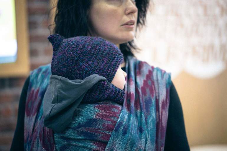 Шарфянка (отзывы по шарфам)Давно я не писала в сообщество, а тем временем нас стало на одного слингожителя больше, причем в этот раз абсолютно бесколясочного слингожителя. Мужчине юному 5 месяцев, весит он 10,5 кг, сам сидит уже несколько дней, слинги любит, только в них и гуляет, но кризис 3 месяцев место имел:) Дебютом сына в сообществе пусть будут наши впечатления о прекрасном шарфе Симфония Зимние грезы от отечественного производителя Полотно студия.