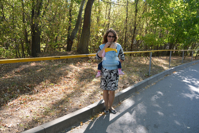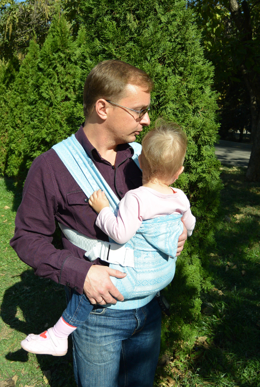Шарфянка (отзывы по шарфам)Тестировали рюкзак мама Марина и дочка Лиза 9 кг , год и семь месяцев от роду. Поскольку дочь все больше хочет ходить своими ножками, а длинные шарфы носить с собой неудобно , я задумалась об альтернативе. Есть у нас рюкзак Гусленок, но в нем долго носить не могу, начинает болеть поясница ( А тут представилась возможность попробовать рюкзак из шарфовой ткани Карауш. Сразу же поразила компактность сложенного рюкзачка, потом запал в душу цвет)) , мой любимый голубой. Не удержалась и сразу же по получении сменила шарф на рюкзак. Первое впечатление - эйфория, я нашла девайс, который достойно заменит шарф! Пока ехали домой на автобусе поняла что нагрузка все-же распределяется не так как в шарфе, но все равно комфортней чем в нашем эрго. Думаю рюкзак дочке маловат, потому что я так и не смогла сделать М-позицию. Следующим испытанием для рюкзака стал поход в зоопарк. Несомненно удобно сажать и доставать бегающего детя, правда мне недоставало приспособления, позволяющего свернуть рюкзак на поясе, не снимая его (как на гусленке). Пробовали носить на боку и сзади - понравилось. Но на боку нагрузка идет на одно плечо и моя спина возмутилась. Гуляли мы долго, уже после того, как Лиза устала, попросилась на ручки и уснула в рюкзаке. Спящего ребенка мне стало носить тяжелее. Еще мне не понравился подголовник - дочке явно маловат, но возможно это потому, что рюкзак вообще маловат. Носить в целом удобно, комфортно, но не более 2-х часов подряд. Эйфория прошла, достойной альтернативы шарфам на долгие прогулки нет (для меня). Зато такой рюкзак сочетается с платьем! Думаю что если сшить такой рюкзак по своим размерам, с нужными "примочками" он станет если не заменой, то достойным дополнением к шарфу. Спасибо магазину Новая Мама за предоставленную возможность тест-драйва!