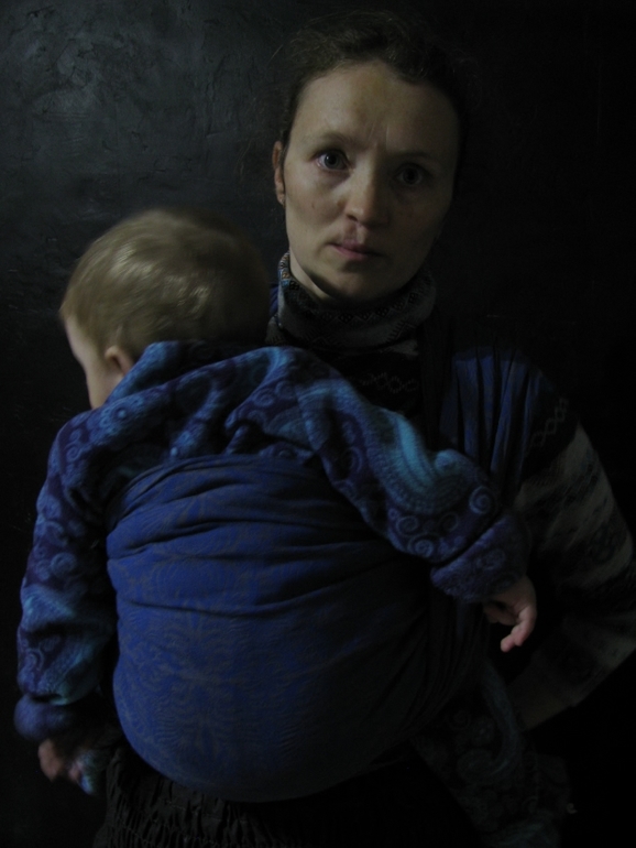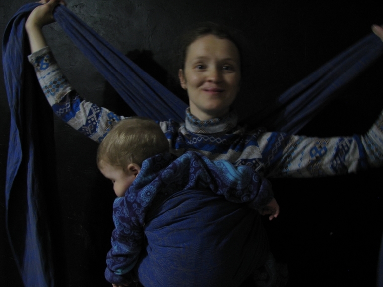 Сын у меня активный, очень любит попрыгать в слинге, и хотя, вес у него средний, носить мне его стало тяжело. Из моих шарфов особой любовью у меня, в последнее время, пользуется яро лен. Ибо он из серии "как прибили так и держится".