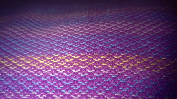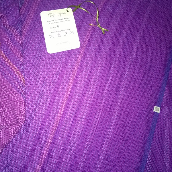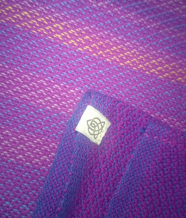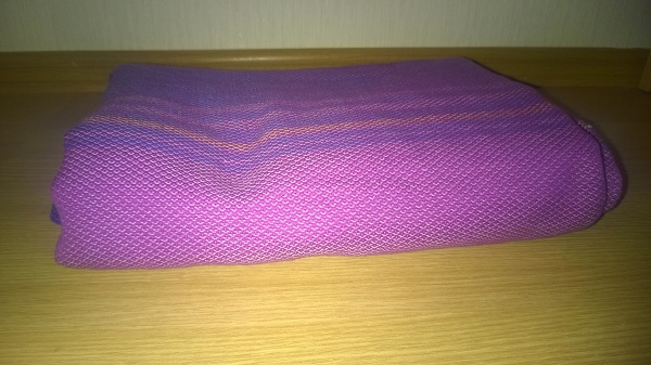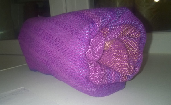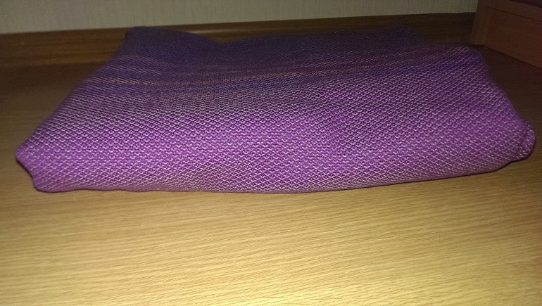 На ощупь - слинг очень текучий, мягкий и рыхлый, я бы даже сказала воздушный, но в то же время рельефный за счет плетения. Единственное, чего я боялась - это тканый борт, и, к слову сказать, зря - полотно очень хорошо подтягивается. За счет «чешуи» слинг очень цепкий, в намотке не ползет, на одном узле держит. Отлично ложится на плечах, мотается легко. Баунс присутствует.