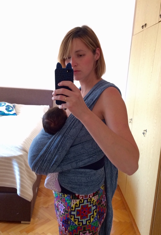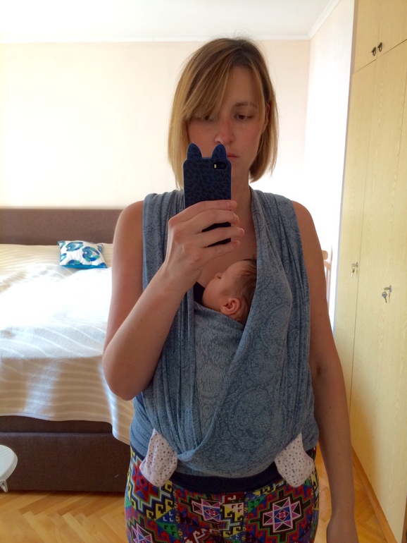 Запрокинутая голова и положение малыша мне свидетельствует о том, что намотка слабовата. Малыш перепросел вниз, недотянута середина кармана, ножки слегка разъехались в стороны.