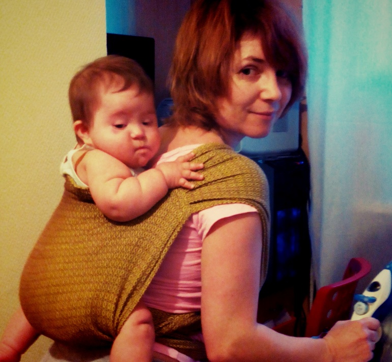 Перешли на заспинные намотки.Спине легче, дитю удобнее, руки свободнее..Правда дочка не поняла вообще, куда сиська делась))))..вобщем, слингоувольнение в запас по нетрудоспособности отложилось...