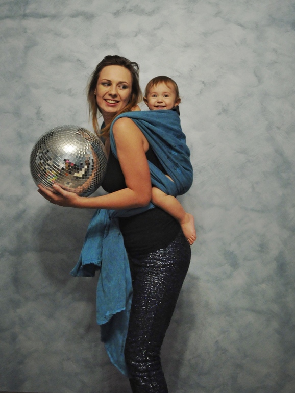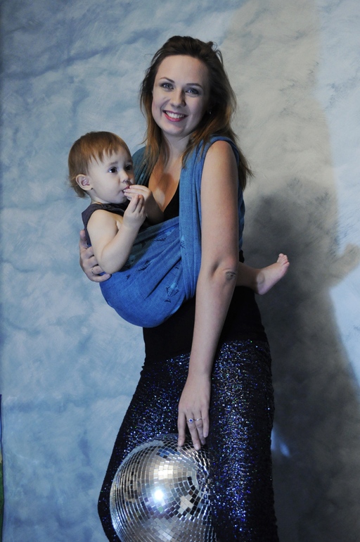В этом сезоне нам пришелся по душе стиль Диско и вещи с паетками. Я нашла просто отпадные легинсы с синими паетками. И к ним удачно подошел слинг Дидимос рыбы карибы.