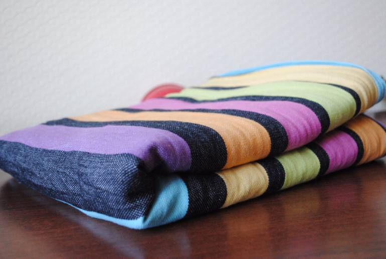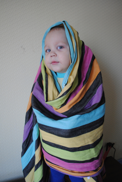 Меня зовут Анна, а слингокарапуза Миша. Хотелось бы немного рассказать о нашем опыте. Уже полгода у нас в закромах лежит шарфик от Little Frog расцветки Флюорит со льном в размере 3,6 м. Вот такой красавец (фото производителя).