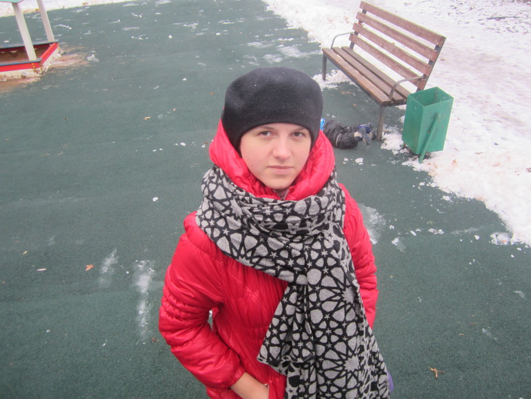 Стильный лук из красной куртки, черных дутых штанов и черно-белого шарфа! Синий комбез Алисы не очень вписывается, но, по-моему, и не очень нарушает :)))