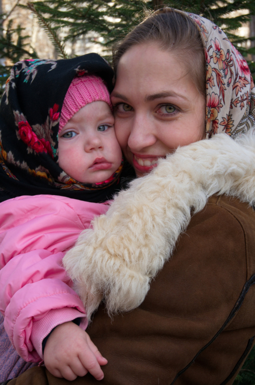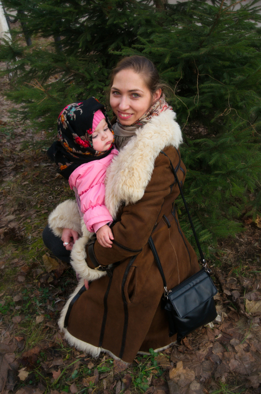 Трендом нашего образа стало Объемное меховое пальто ниже колена, а также трикотажное мини платье. Образ я могу описать, как русский стиль, потому дополнили мы его павлово-посадскими платочками, сапожками и сумкой в цвет, имитация валеночек на дочке, изюминкой стали сережки в виде матрешек.