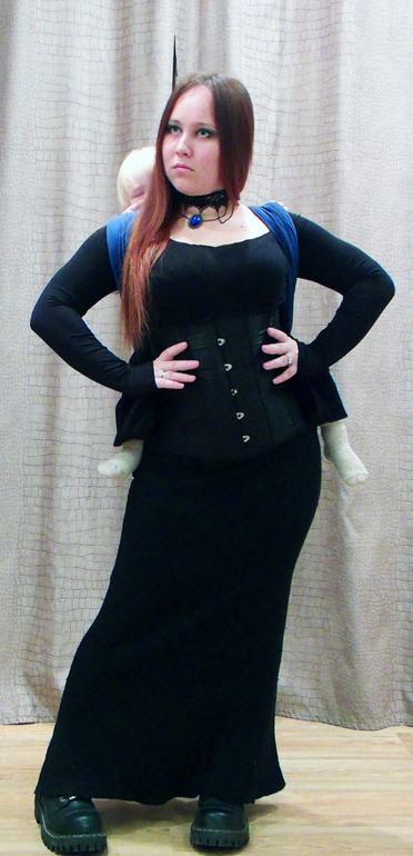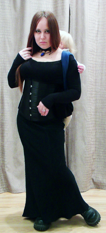 Конечно же готика- это черный цвет, черная кофта с длинным рукавом, на талии затянулся мой любимый подгрудный корсет, длинная юбка-годе мягко легла на тяжелые ботинки, популярного когда-то бренда Camelot.