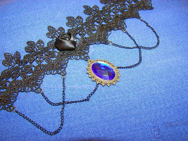 И непременно кружева...Шею обрамляет кружевной ошейник с массивным камнем глубокого синего цвета.