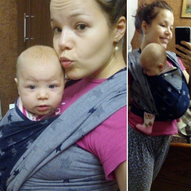 Уже в последний день нахождения слинга у нас в гостях я, почитав другие отзывы об этом шарфе, решила по примеру одной из мам попробовать намотать мой любимый КНК. И - о чудо! - получилось! Узелок сзади был малюсеньким и смешным, но намоталась я на одном дыхании, без дополнительных регулировок, а дочка с комфортом заснула на дневной сон. К сожалению, наш папа-фотограф был в это время на работе, да и причесываться для фото не было времени, поэтому пришлось довольствоваться селфи в домашней одежде с гулькой на голове :)