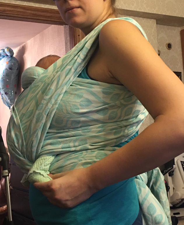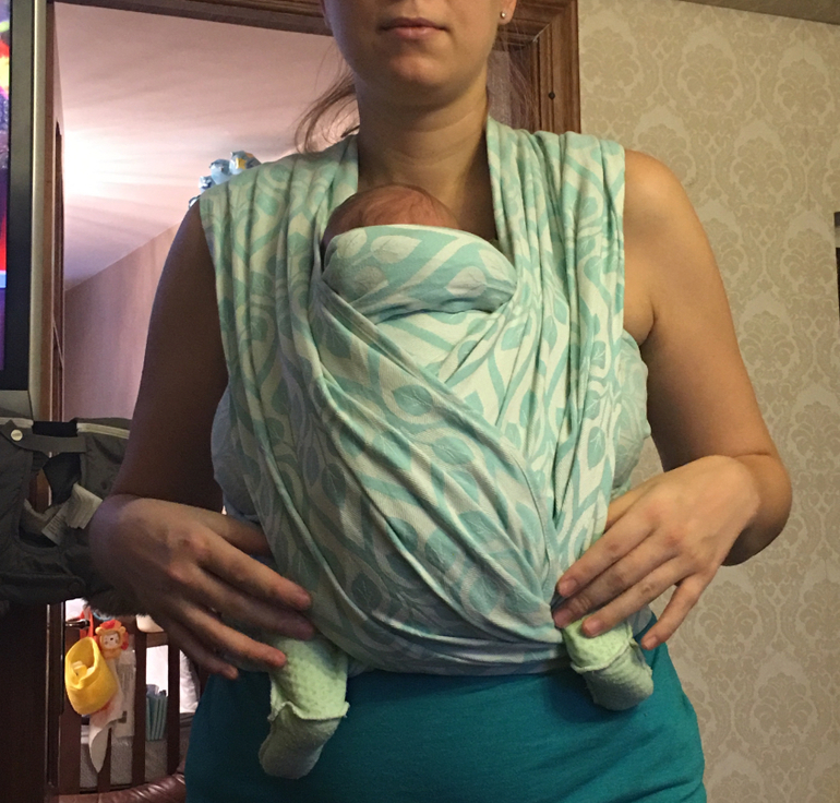 На первом фото с намоткой много ткани на ножках ребенка. Ниже коленей ножки тканью не надо закрывать. Если карман хорошо заправлять между собой и ребенком, то и ткань на ножки низко никак не уйдет)