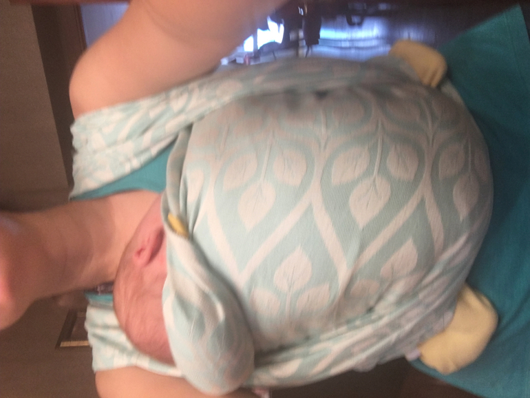По намотке - там где полотна расправлены, есть ассиметрия ножек - они на разной высоте. Так носить не стоит. Поправляйте перед зеркалом, чтоб было симметрично. И когда поправите, сразу увидите, где слабина в ткани из-за которой малыш и завалился вбок - всю эту слабину надо подтянуть до узла.