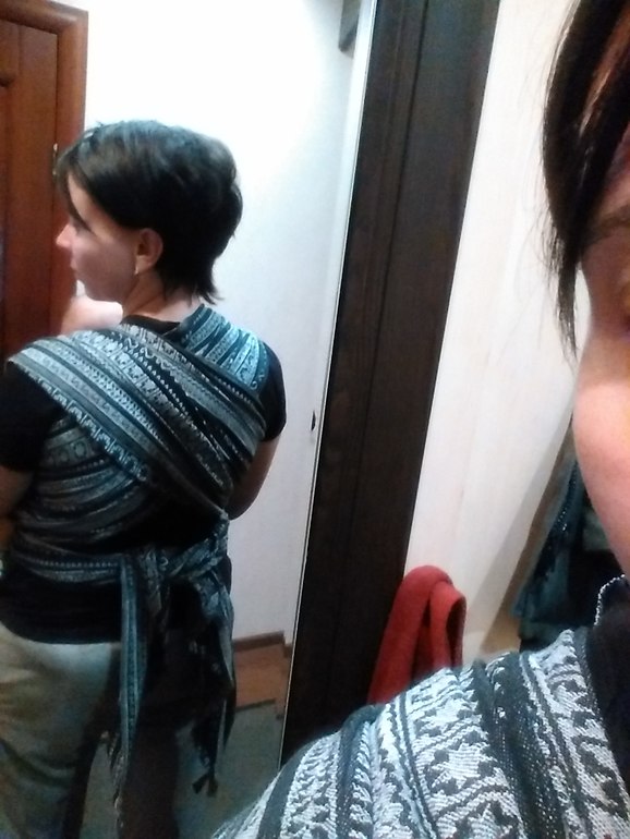 Жгутик под коленочками переберите гармошечкой и распределите равномерно по бедру. По спинке видны не большие пузыри, старайтесь более равномерно кармашек подтянуть. Есть ощущение, что ножки широковато, голени должны быть направлены вертикально вниз (возможно это из за одежды так натянулось). После окончания намотки, нужно подкорректировать позу, взяв малыша за голени подталкнуть коленочки вверх и как бы сближая их.