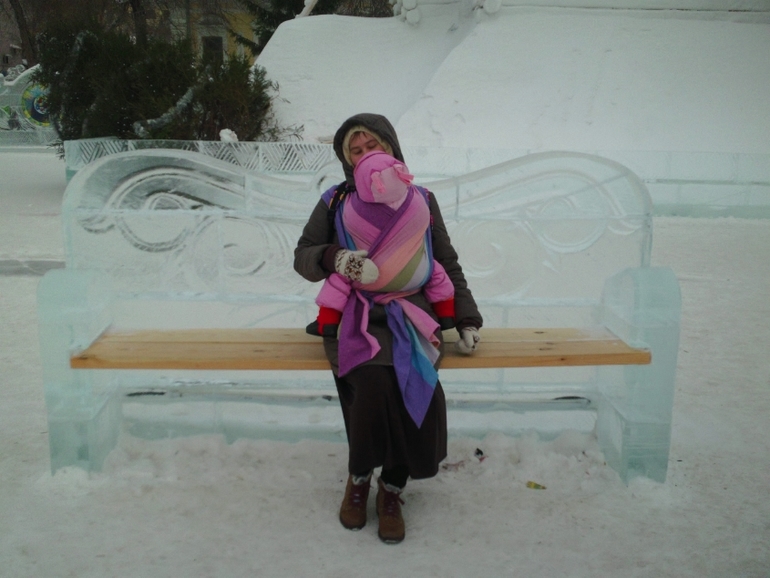 Намотка под куртку доставила неизмеримо больше радости. Для начала я решила обойтись с ним строго: не стала расправлять полотна в кнк. Даже не знаю, что на меня нашло) И что же? Шарф повёл себя достойно и нёс мои прыгучие 10 кило, хотя намотка всё же поплыла (ещё бы она не поплыла, вспомнила я вдруг, почему больше не ношу свою прыгучую дочку в однослойных намотках). Мои гекконы такого испытания не выдержат)
