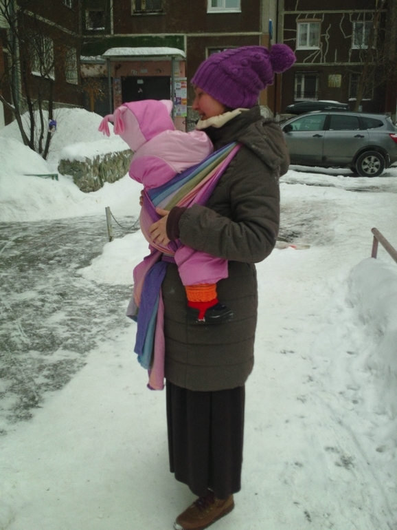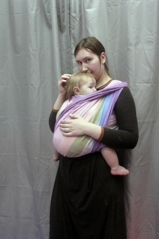 В заключение хочу сказать, что шарф не младенчиковый, не нежный, он прекрасно подойдёт деткам от трёх-четырёх месяцев, начинающим тяжелеть, и верно прослужит до перехода на супер-грузовозы.