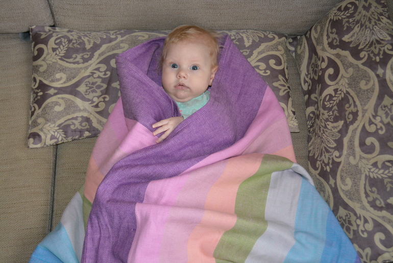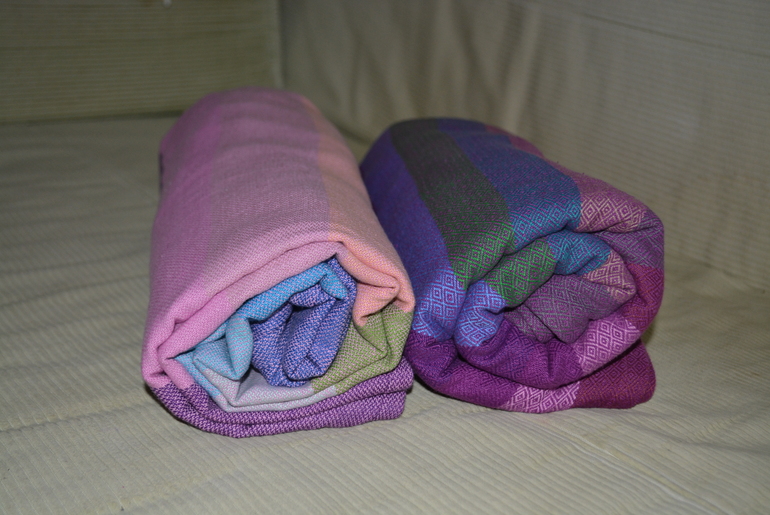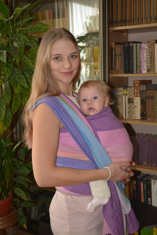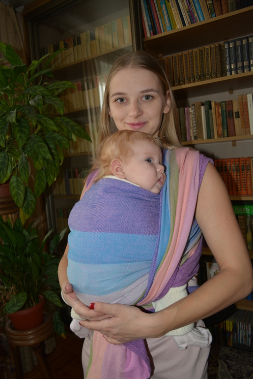 Первое, на что я обратила внимание - это расцветка. По сравнению с шарфом с алмазным плетением, полоски шире. Цвета очень красивые, а полоски с одного борта розово-фиолетовые, а с другого - голубые, так что мотая слинг то одним, то другим бортом вверх, можно делать его более мальчиковым или девчачьим. Мне очень нравится, когда один шарф может смотреться по-разному в зависимости от стороны.