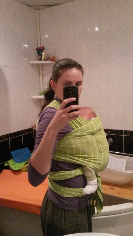 Что можно улучшить: малыш чуть заваливается телом в сторону, можно руками поверх слинга его поправить, чтобы тело было ровнее вертикально. Это может быть в том числе от мешающих полотнищ, расправляйте их с перекрутом на плече: на ребёнка расправляется не тот борт, что у шеи, а дальний, что у вашего плеча.