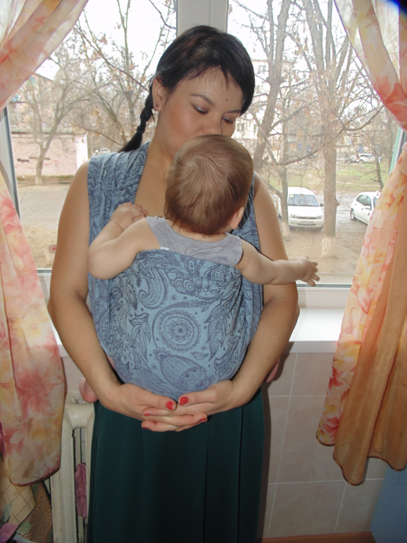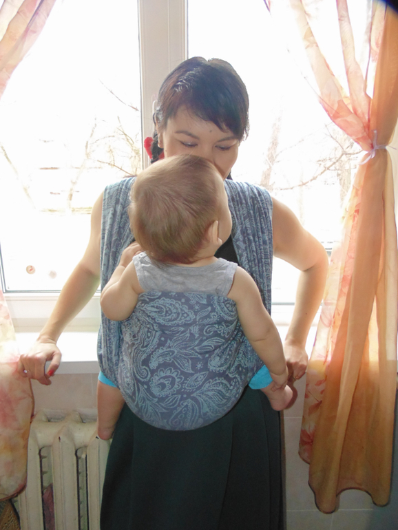 Мы - мама Юля и слингопассажир Исен, 11 месяцев. Мои впечатления. Шарф приятной не броской расцветки, универсальной, вроде и мятный с серым, но все-таки мятный какой-то и голубой. Люблю жаккардовые слинги за то, что можно носить и изнанкой, какое-то цветовое разнообразие получается. Сам слинг плотный, хоть и мягкий, в моем понимании какой-то покрывалистый. Летом бы в нем нам с малышом было однозначно жарко. Напомнил мне по плотности мой Little Frog Aquamarine. Зато грузовозный. 11 кг сына в нем растворялись. Носить было легко. Сам шарфик за счет жаккардового узора цепкий, но наматывать это не мешает, мотала огурчики левой пяткой, и держали они своего пассажира на одном узле. На одном, т.к. шарфик мне маловат( Но и этот один узел держал на ура