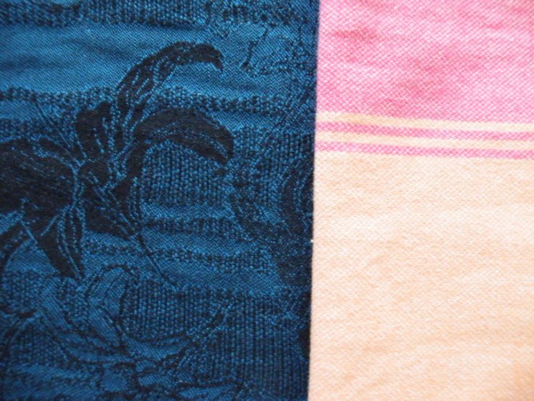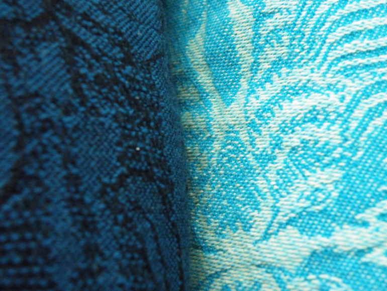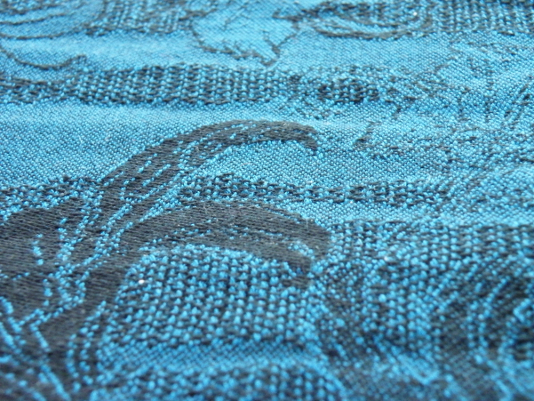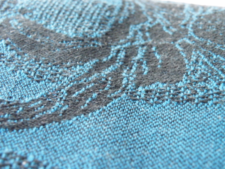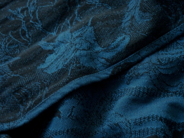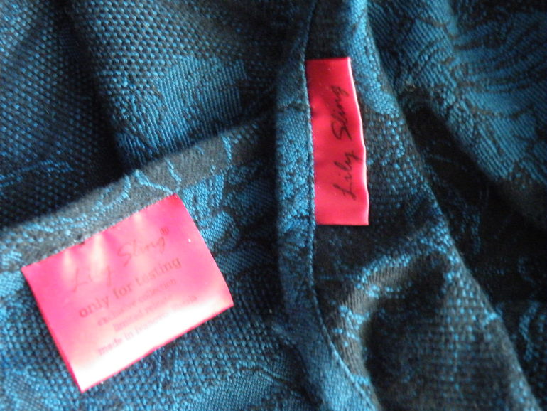 Мне сам паттерн (видела обзоры в цвете джинс) не очень нравится, на мой взгляд лилии слегка топорны, им не хватает изящества. И волны текстуры, призванные увеличивать цепкость, тоже на мой скромный взгляд шарф не красят. Но черно-синий шарф очень понравился! Паттерн читается с трудом, издалека шарф выглядит как иссиня-черный с каким-то орнаментом. Плюс универсальность, под него можно надеть любую одежду и не выглядеть безумной цыганкой или хиппи. Стильно в общем. Стильности добавляют и ярлычки, красные, атласные, дорого-богато=)) Ярлыки с обеих сторон, не люблю эту фразу. Ну что за убожество пришивать с одной стороны, я вообще такие слинги не понимаю, но, оказывается, до сих пор встречаются «экономисты».