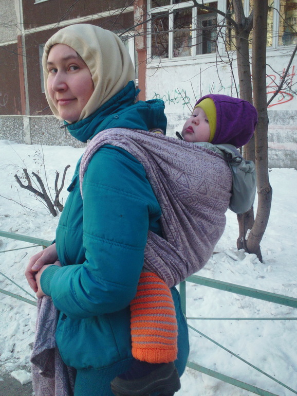 При первом тактильном знакомстве Африка показалась мне могучим грузовичком. Грубоватым и неповоротливым, но мощным. Я всегда мотаюсь тщательно, везде подтягиваю, но этот шарф было так трудно мотать, что я чуть не вывернула пальцы. Картон, фанерка, деревянный - именно так я его охарактеризую. Удивительно, до меня его носили три тестера, он пережил три стирки. Первые два дня у меня от него жутко ломило плечи. Какой там грузовик, мои плечи так жалобно ныли только от младенчикового Келума. Рюкзак на куртку - десять-пятнадцать минут, и я спускаю ребенка на землю. Перематываюсь на робин - еле дошла до дома. Ладно, предположим, я криво намотала. На следующий день мотаю кнк со всей тщательностью. С трудом пытаюсь уложить эту картонку на плечи, вытянуть, завязать узел. Завязать узел - самое сложное. Прыгаю и тяну концы в разные стороны, иначе просто не получается. Два узла? Нет, спасибо. Я лучше подверну второй раз. Через минут 30-40 у меня снова болят плечи...