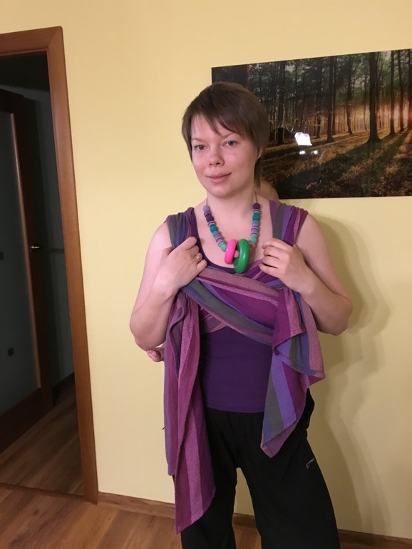 К расцветке я привыкла, нашлись у меня даже бусы в цвет и майка 😋 Но, прилива нежности эта расцветка у меня не вызвала, и я так и не поняла, чем конкретно она мне не угодила. Толи очень резкими переходами цвета, сиреневый, а потом резко зелёная полоса, не знаю.