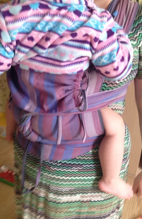 Вид сзади (лямки широкие, их легко поправить и подтянуть, засчёт шарфовой ткани слинга хорошо распределяется даже приличный вес ребёнка):
