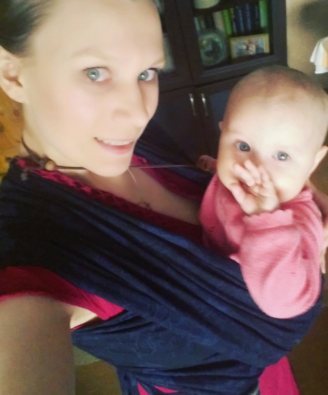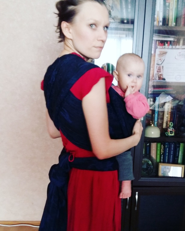 Мотаетя шарфик легко. Моя непоседа дочь (8 месяцев, 7,8 кг) пыталась как всегда работать намотку, но это получилось у неё не сразу. Шарф держал достаточно крепко. При этом легко подтягивался, если намотка все-таки сползала.