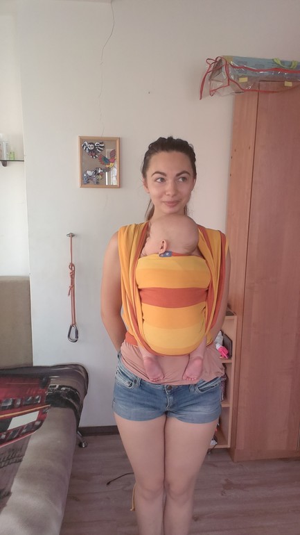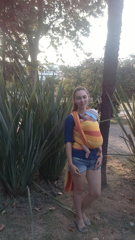 Этот слинг сразу приглянулся мне и сыну - он яркий и солнечный. Мы не ошиблись: не имея опыта использования шарфов, мы достаточно быстро справились с намоткой. Это было счастьем для моей спины! Шарф очень послушный, прекрасно регулируется, держит намотку и распределяет нагрузку. Для меня это очень важно, так как Яромир уже достаточно тяжёлый. Оказалось, что даже долгие прогулки без коляски нам теперь по плечу) Единственное, чего я опасалась - это сочинская жара, ведь этот слинг не создаёт впечатление хорошо продуваемого,. Могу сказать, что мне было комфортно, хотя Яромир немного перегревался. Ну и конечно, такой позитивный шарф привлекает всеобщее внимание! Благодаря ему мы даже проходили без очереди в магазинах, чего обычно не дождёшься, перевозя ребёнка в коляске. Такой шарф - это стильный и полезный аксессуар для мамы.