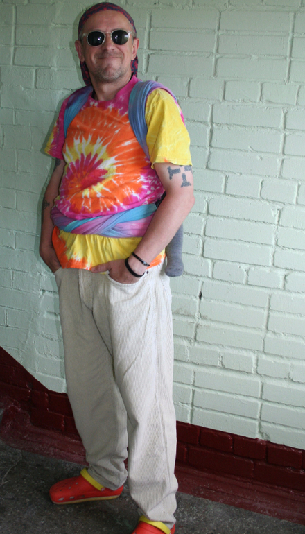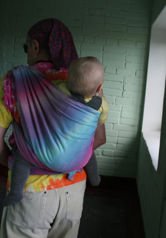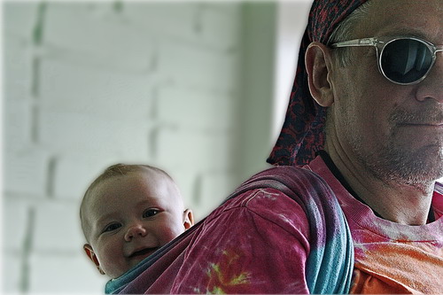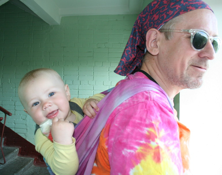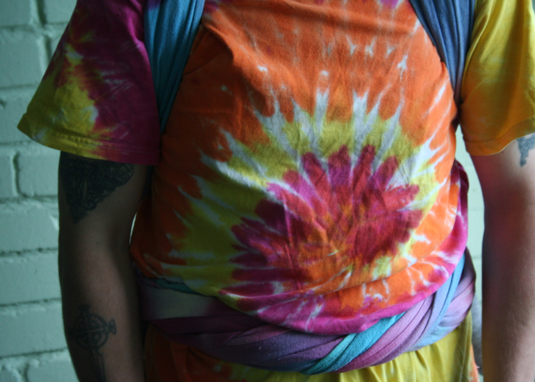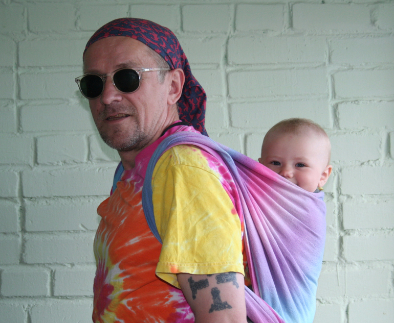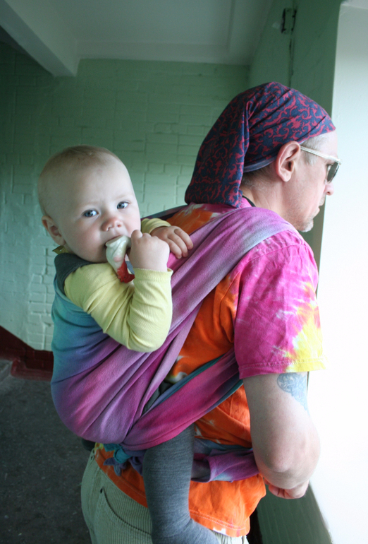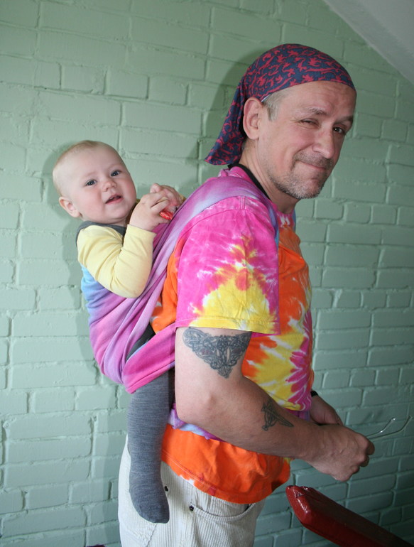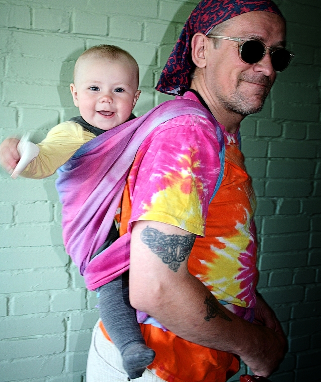 Тренд - tie-dye. В роли моделей - слингопапа Гера и девочка Соня 11 месяцев. Почему муж? Он не очень любит фотографировать, а я люблю, так что мне проще уговорить мужа походить немного в шарфе, чем пофотографировать меня в шарфе))