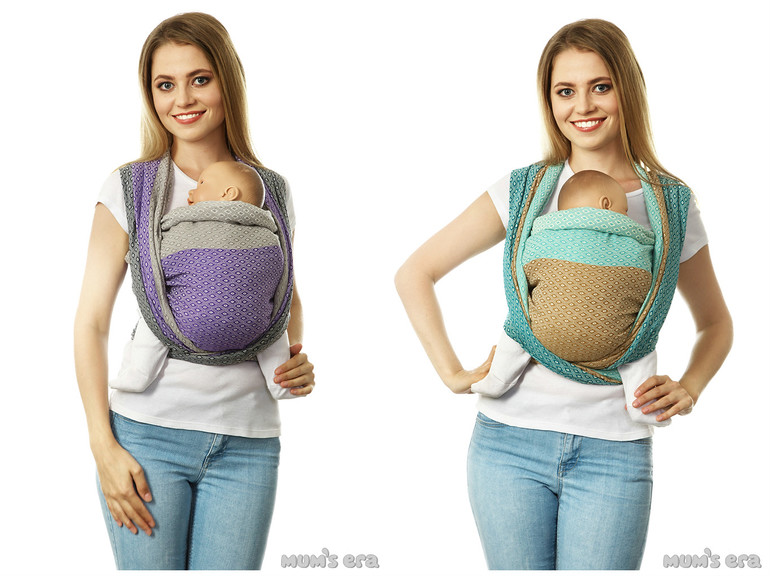 Три контрастные полосы идут по всей длине слинга, от края до края. При этом цвет полос в каждом шарфике выдержан в одной цветовой гамме, серо-фиолетовой или бирюзово-коричневой.