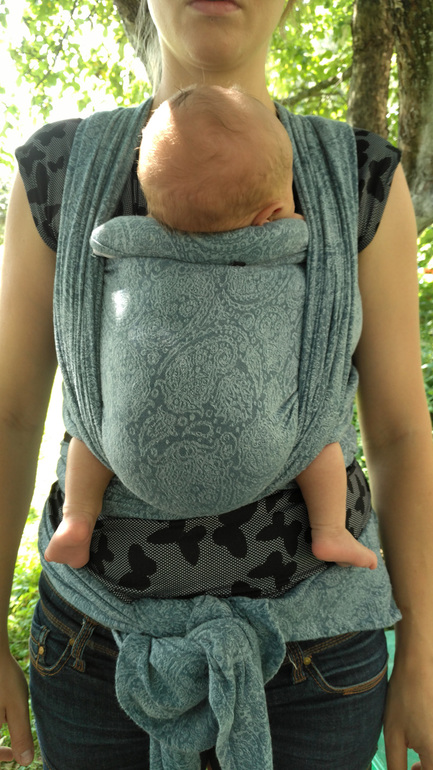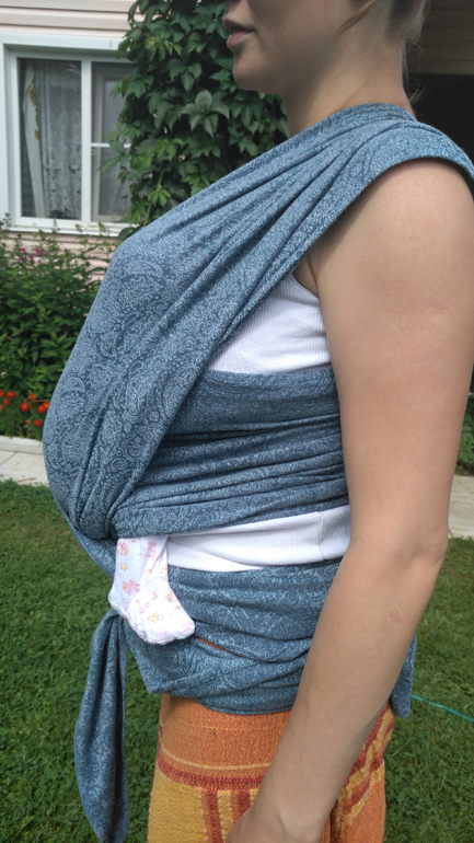 По поводу слабого оборачивания вокруг талии. Это не так, я очень туго затягиваю. Думаю, так визуально кажется из-за того, что края скошены на ellevill и край самой широкой части остается висеть. Разве стоит завязывать узел сзади? Я смотрела видео на слингопарке и там напротив учат сзади только скрестить, а узлы вязать уже спереди. Слинг брала длинный (7-ка) специально, чтоб хватало длинны на узел спереди, а не сзади.