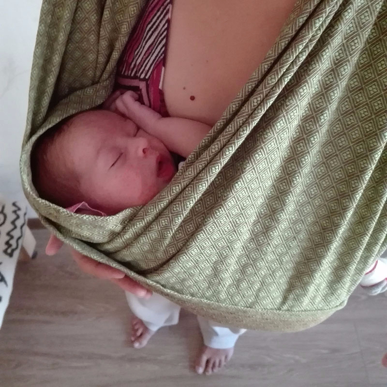 Только что подарили нам слинг-шарф Yammy Mammy, размер М, алмазное плетение. Силами четырёх рук умотали одного 5-недельного младенца с дикими коликами. Никогда раньше слингами не пользовалась. Под карманом немного край ткани выбился, но основной массив лежит там вроде правильно, под спиной малыша. Делали по видео на ютубе про намотку колыбельки в кресте над карманом от канала Слингопарк.