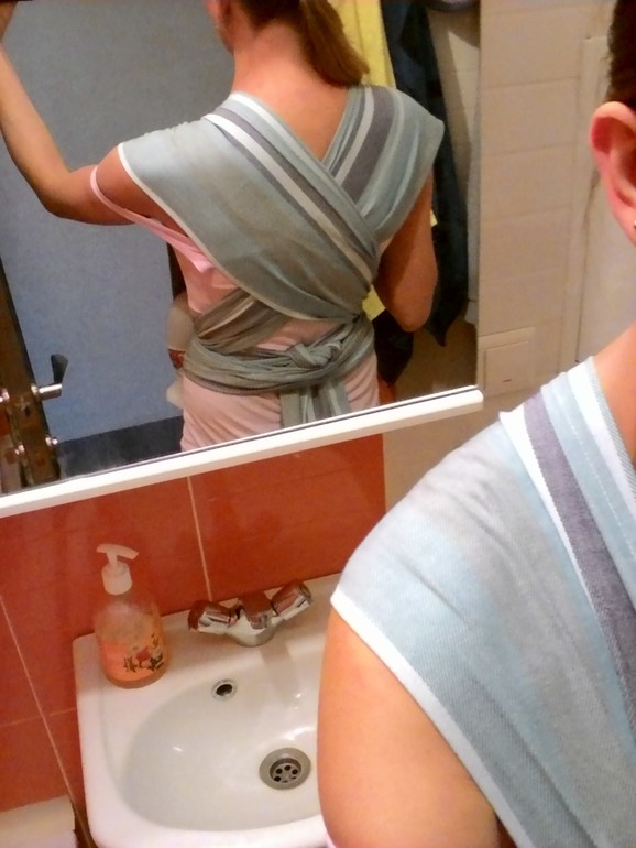 Учимся носитьУбрала крест со спины, лямки пустила под ножками. Сами ножки после намотки свела коленками кверху, попу подкрутила.
