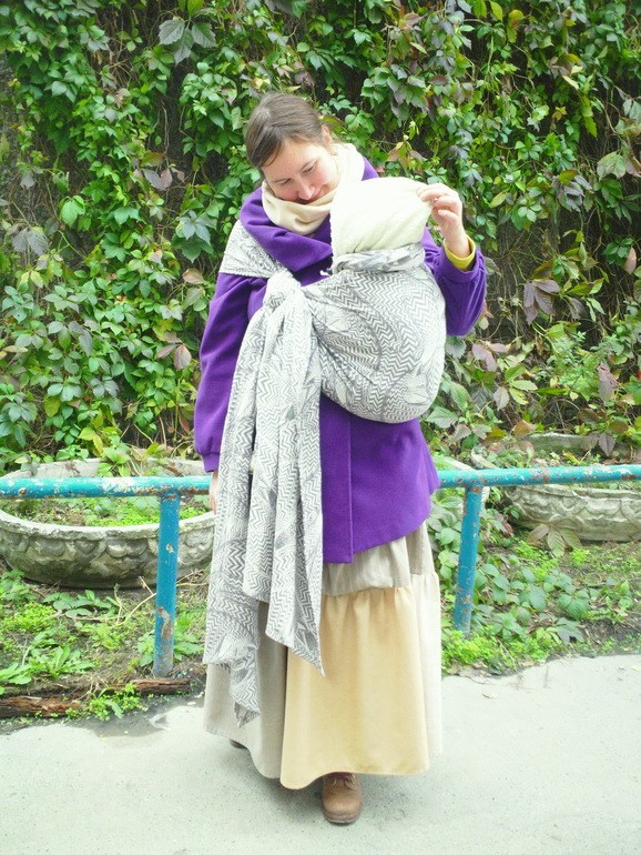 Про этот шарф могу сказать сразу: он прекрасен! Можно назвать его шарфом удающихся намоток. Я опробовала на нём все возможности тройки: рюкзак, кенгуру, крест на бедре и ребозо. Даже капризная кенгуру мне на этот раз далась без проблем, потому что шарф легко переворачивается на другую сторону, ткань не путается сама в себе, как у меня происходило с другими шарфами. Ткань не толстая и не тонкая, в самый раз, посерединке. Прекрасно драпируется и струится вниз. Фиксирующий узел и узел в ребозо получаются аккуратными, я даже вязала его на шею и завязывала на два узла, смотрелось отлично.