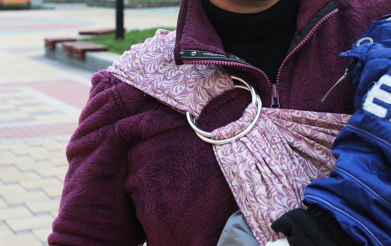 Мягкий,пластичный,податливый слинг. Ткань в кольцах отлично расправляется и подтягивается.Слинг удобен в ношении как на верхнюю одежду,так и обычным образом. Я довольна!