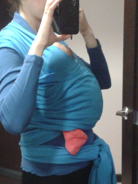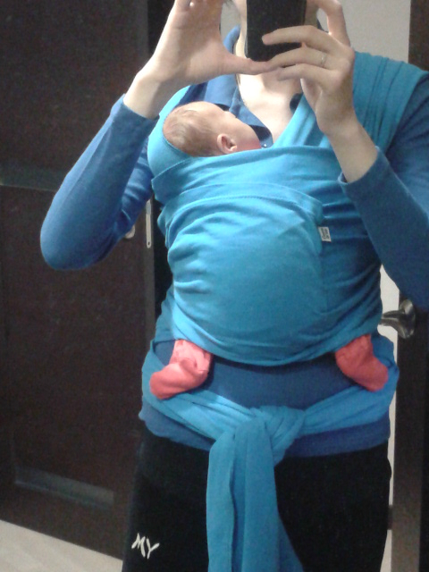 Я всегда мечтала о слингах и решила начать с малого - трикотажного слинг-шарфа. Попробовали две намотки - колыбелька и вертикальное положение в кресте под карманом. Колыбелька с полной поддержкой головы (в трех слоях ткани) доче понравилась не очень, видимо, жарко и не очень удобно. А в двух слоях уже поддержка не та, все равно приходится поддерживать рукой.