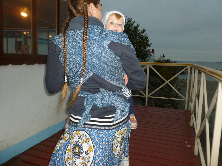 Слингопассажир уже довольно большой, мотаемся не очень часто, да и захворал слегка, поэтому намотать шарфик удалось всего два раза - один на сон, второй на фотосессию.