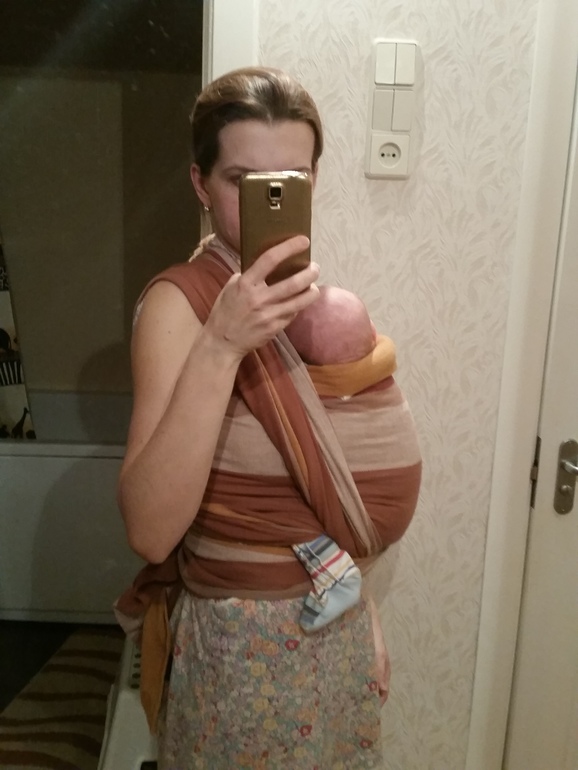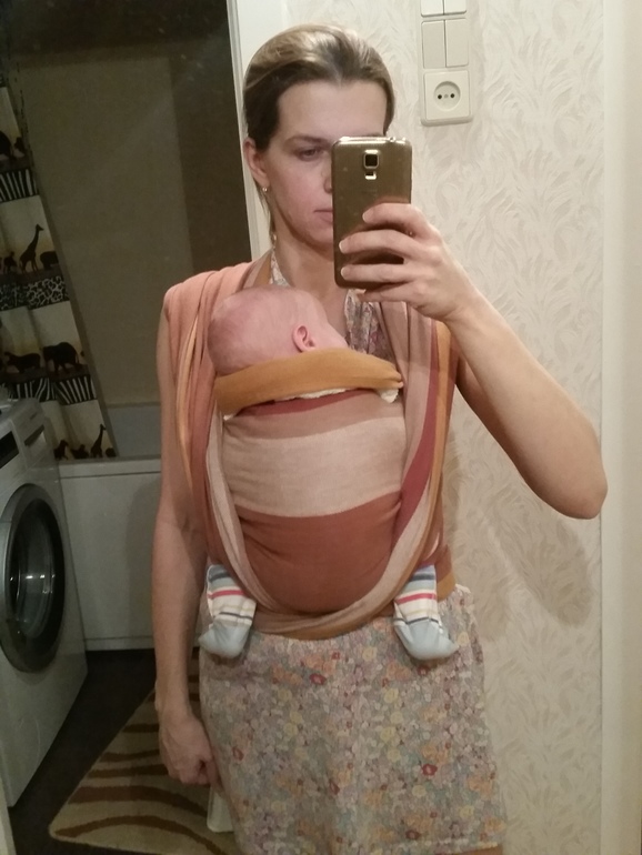 И ручки ребенка лучше опускать вниз, к вашим бокам. Потом, когда малыши набираются сил, они начинают руками от мамы отталкиваться и разбалтывать намотку)