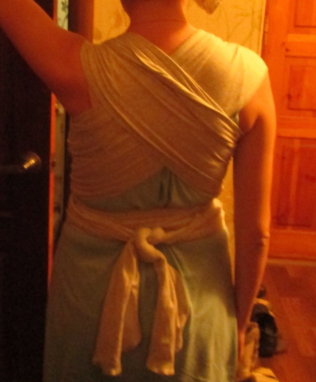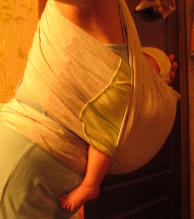 Вроде неплохо все, только ножки на разной высоте и валик нужен, если длины слинга не хватает делайте из пеленочки/полотенчика, скручиваете или складываете в жгут и проводите его по шее ребёнка, а хвосты засовываете за полотна по вертикали. И ещё, это ведь трикотажный слинг? Намотка у вас крест над карманом, а в трикотаже только крест под карманом использовать можно.
