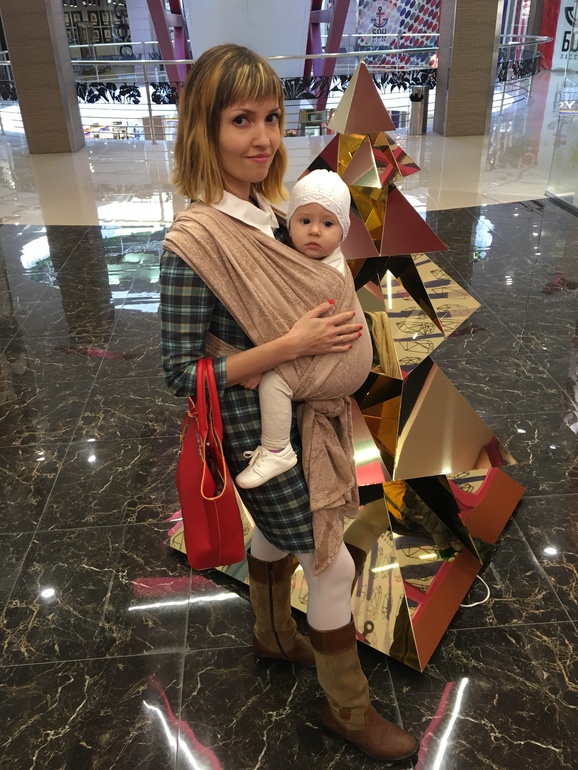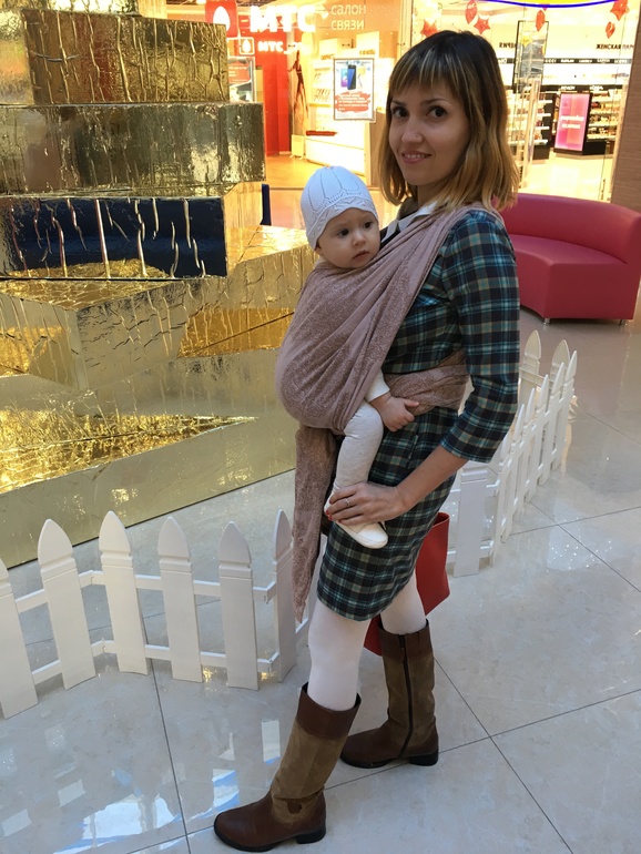 Про сам шарф уже много всего сказано. Так что Америку не открою. Мягкий, рельефный шарфик, больше для младенчика, но может быть универсальный на весь период слингоношения. Легко мотается, хорошо подтягивается. В простом кресте дочкины 9+ кг я выдержала полчаса, потом плечи стали ныть.