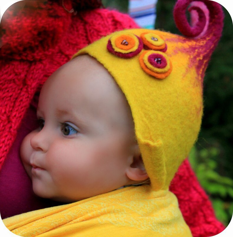 Я из тех слингомам, которых сразу мыслят цветовыми сочетаниями и конкретными аксессуарами. Еще будучи беременной я увидела сваленные из шерсти гномичьи ботиночки мастерицы из Литвы и они запали в мою творческую душу глубоко и надолго. Потом так же долго я их ждала... потом дождалась свою малышку, а уже потом появился ССК Ellevill Diva Essenza Lemon и идеально вписался в образ! Он нашел нас, а мы его. Солнечно-лимонная расцветка и сказочный принт - пэйсли у меня всегда ассоциируется со сказкой.