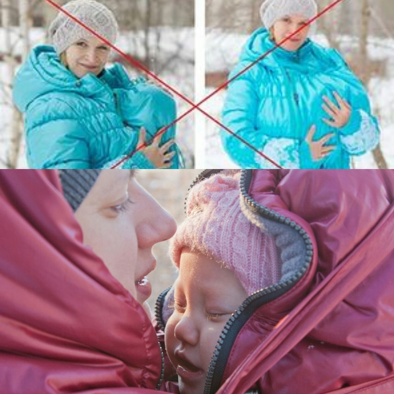 2. Ребенка под слингокурткой носим только вертикально! Второе правило следует из первого. Разместив малыша под курткой в положении «колыбелька», вы почти неизбежно будете вынуждены прикрыть его голову полой одежды. Даже если на куртке есть прорезь для вентиляции, полноценного доступа кислорода она не обеспечит! И главное - вы не видите и не можете оценить, как чувствует себя ваш ребенок, все ли с ним в порядке.