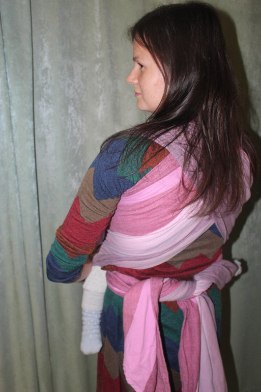 Состав шарфика 100% хлопок, длина 4,7 м. Тестировала на дочке, возраст был 7-12 мес. Мои параметры 46 размер, рост 175 см. Шарфик очень пухлый и плотный. Первое время немного тяжело его было подтягивать.