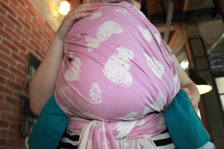 Шарфик ездил на встречу мам. На ней мнение о младенчиковости слинга было подтверждено)) Мотали пассажиров в районе 8-9 кг. При не тщательной намотке начинает резать плечи.
