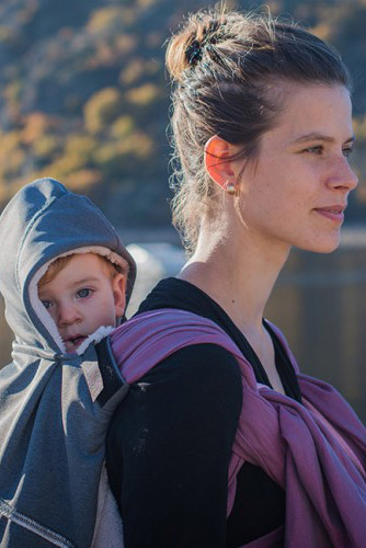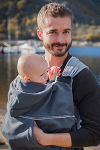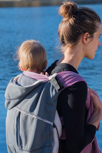 Может использоваться как при ношении спереди, так и сзади. А кроме того - имеет специальные отверстия, чтобы использовать накидку в автокресле.