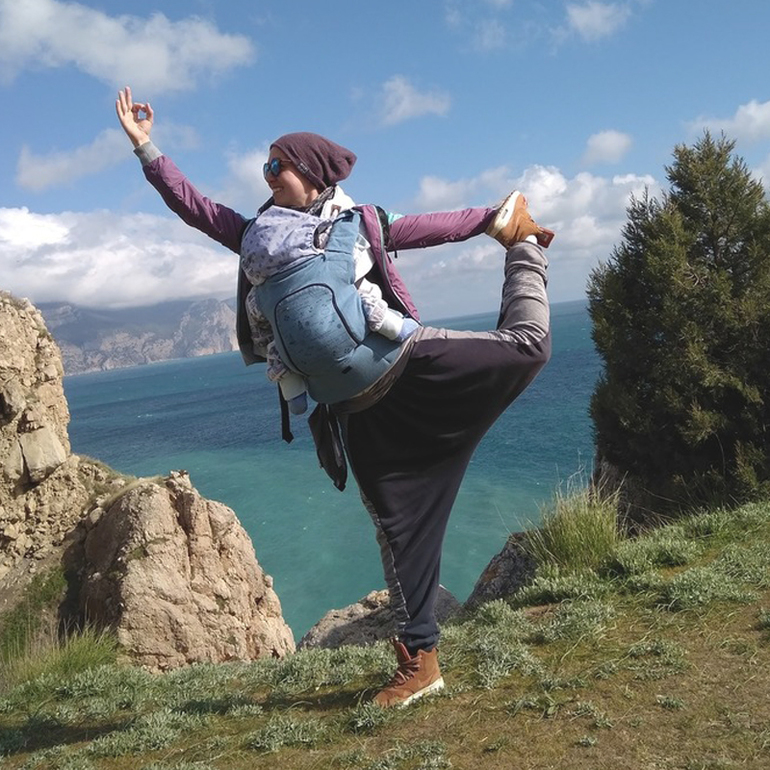 На фото: Инструктор йоги, слингомама Евгения Корниенко выполянет асаны с малышом в рюкзаке от #ilovemum