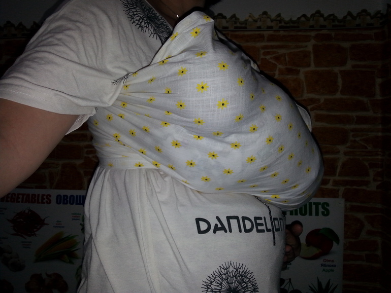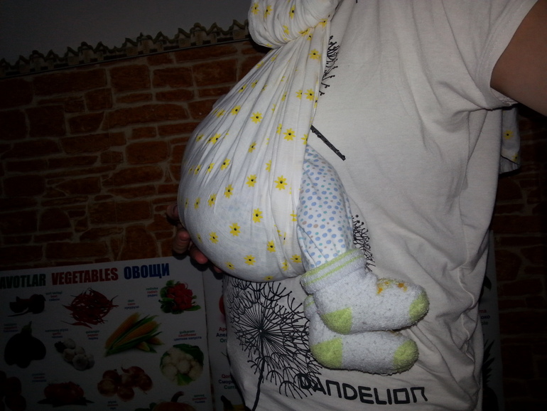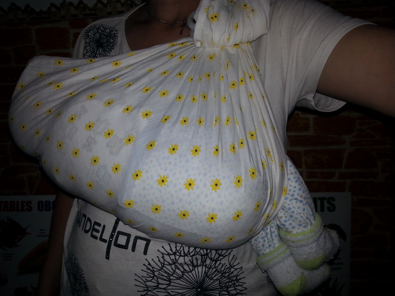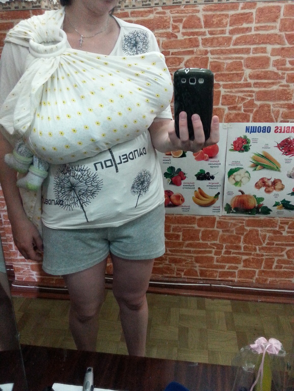 А до какой части головы можно натягивать ткань? Я и не ношу пока. Только учусь. Натянула, уложила, сфоткала и вынула ребенка.