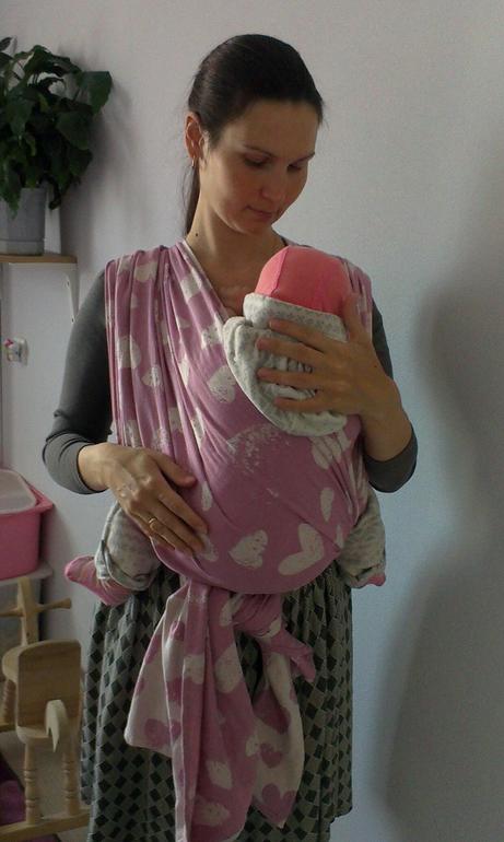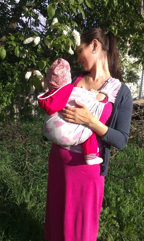 Шарфянка (отзывы по шарфам)Спасибо компании mum's era за предоставленную возможность попробовать слинг-шарф "сердца" в 6м размере. Открыв упаковку, я была приятно удивлена мягкости и нежности этого шарфа. Даже не верится, что это хлопок. Кажется, что шарф с кашемиром. А эти милые сердечки, такой девичий паттерн, и цвет- сиреневый с одной стороны и молочный с другой. У нас кризис веса, и не в каждом шарфе можно комфортно нести несколько часов 9 несидячих кг. В этом слинге час спокойно гуляли, дольше уже тяжело. Под курткой вполне комфортно в нем. Шарф достойно несет как в однослойной намотке, так и в многослойной. Пробовали крест над карманом с нерасправленными полотнищами, простой крест и робин с кольцом.