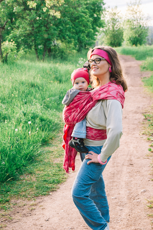 Немного повторюсь: на маме брюки-бананы, топ с рукавами летучая мышь, детка тоже вся такая спортивная. Из аксессуаров: серьги кольцами, пластмассовый браслет и повязка на голову. Дочь поддержала тренд розовой шапкой, которую регулярно стаскивала с головы, чтобы комарам было легче ужинать. Ну и сам шарф - Yaro Slings La Fleur Rose-Natural Hemp с коноплей (40℅). Плотный, но не толстяк, в намотке послушен. После держит как прибили. Спине хорошо. Благодарю за возможность потестить шарфик Лену moilenna.