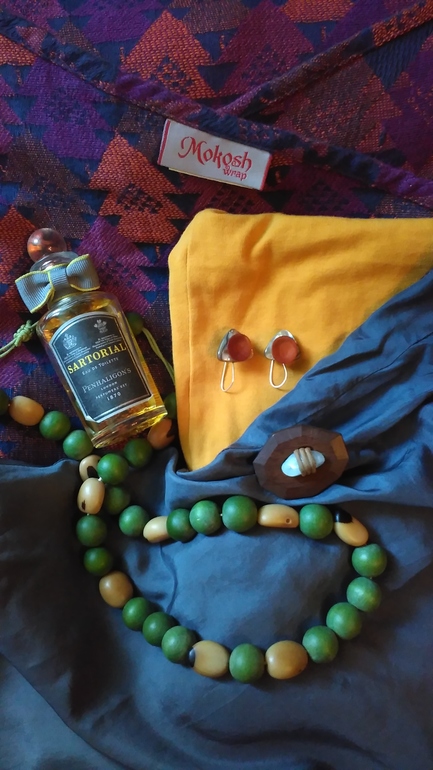 .* немного бижутерии любимой марки: треугольные серьги с оранжевой середкой и деревянное кольцо-многогранник с голубым камнем, перекликающиеся с геометрическим узором слинга. Для цвета и деткиного развлечения - зелёные бусы из дерева и бобов.